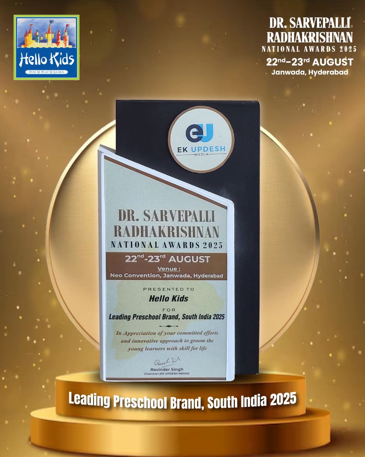 Leading Preschool Brand, South India 2025 - Dr. Sarvepalli Radhakrishnan National Awards, Hyderabad